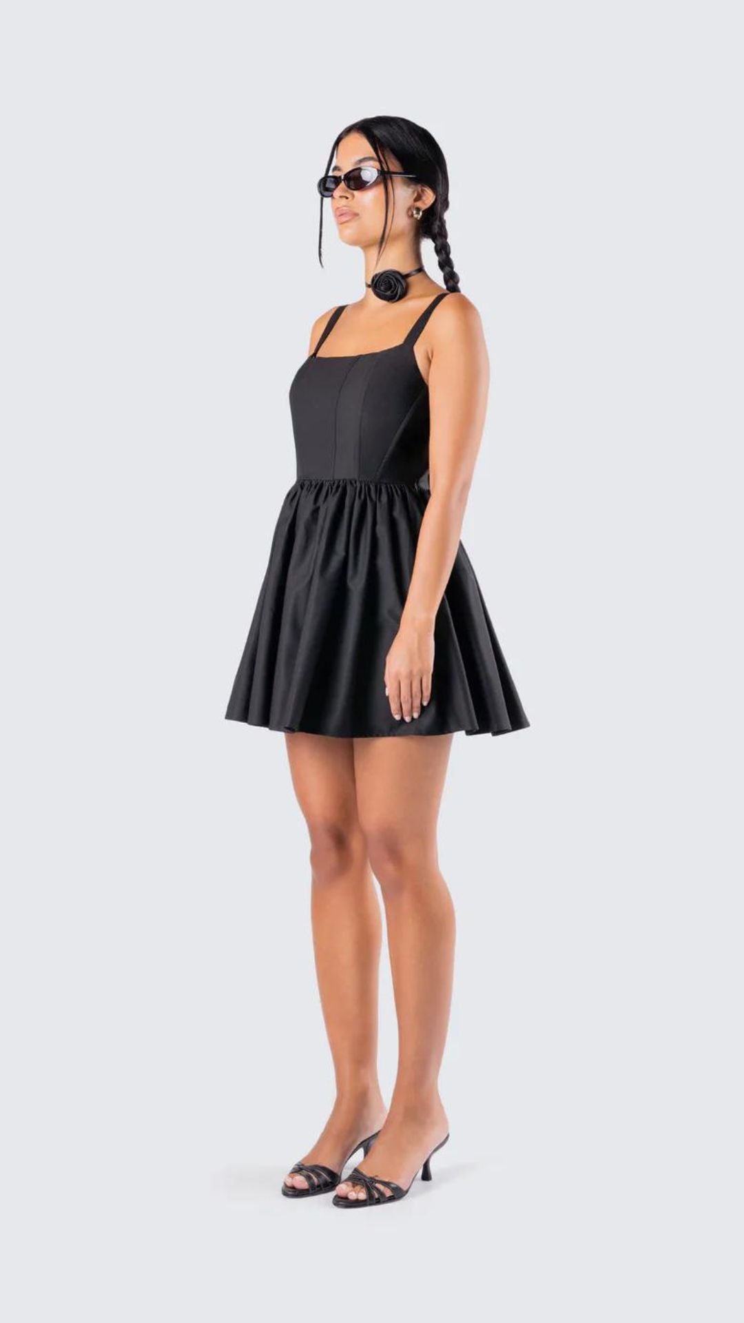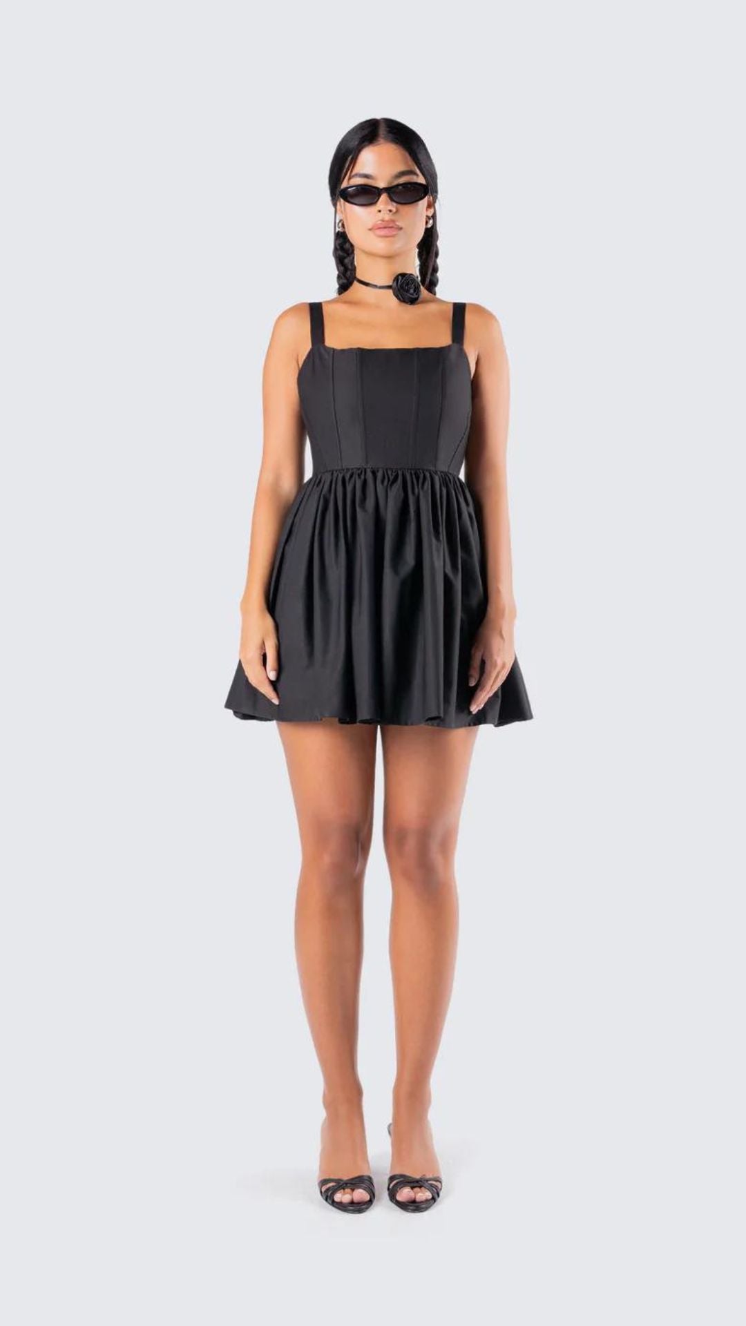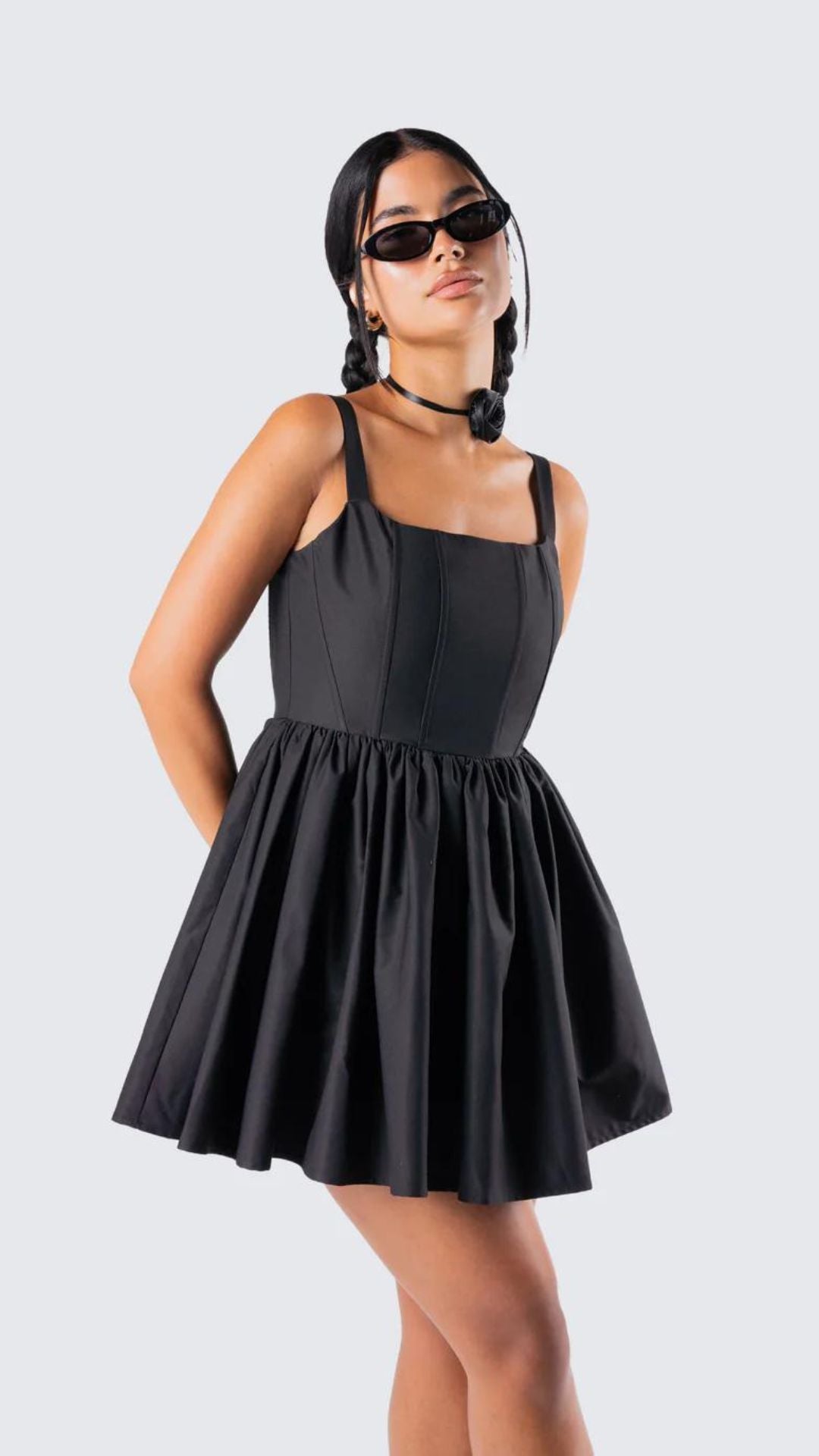 Black Mini Dress with Corset Torso and Gathered Flare Skirt – Chic and Flattering.