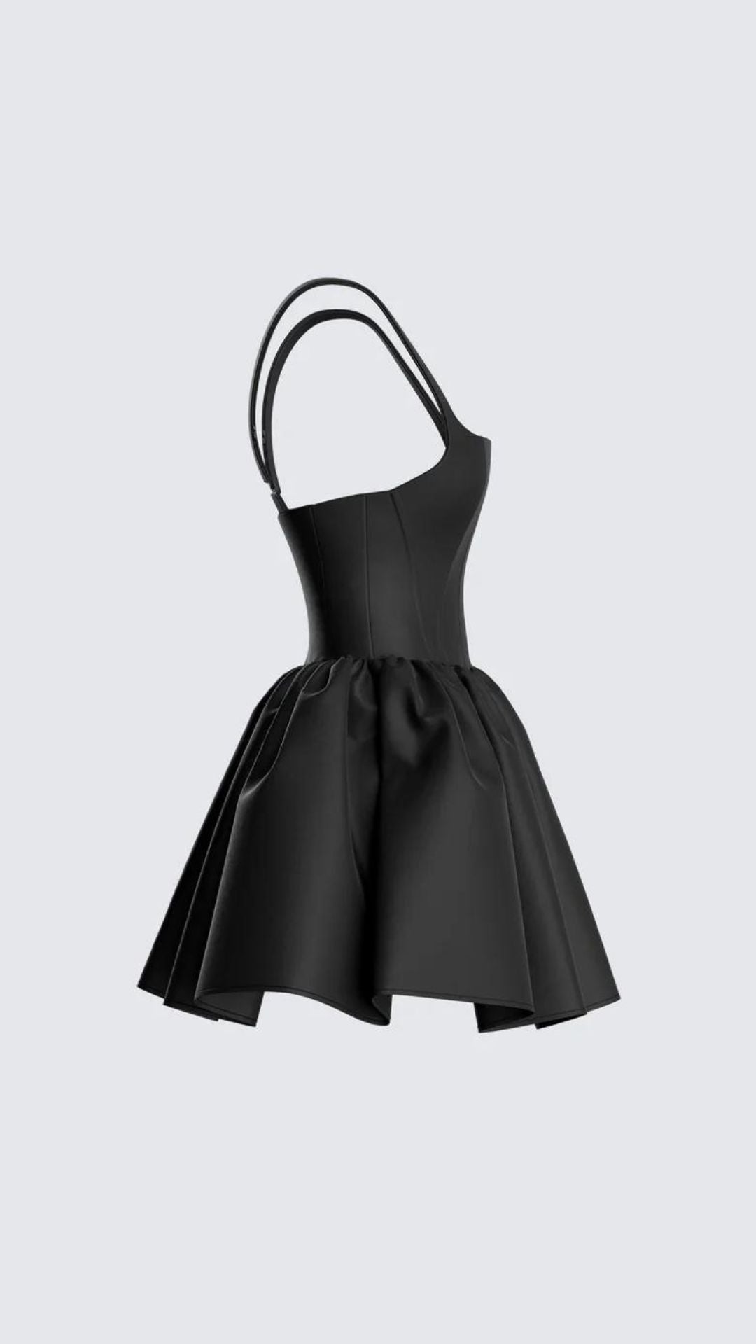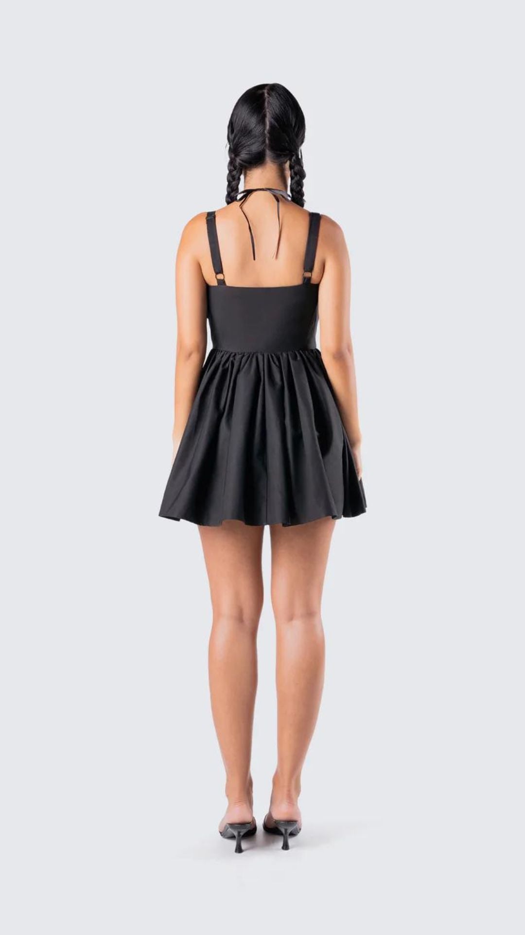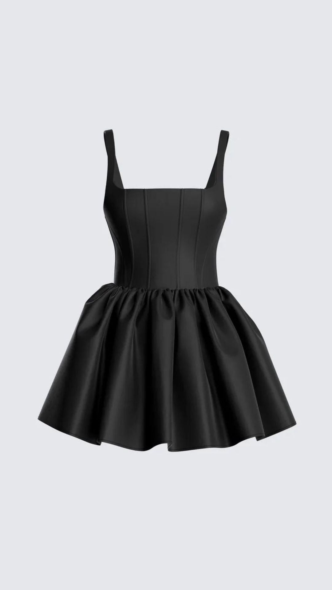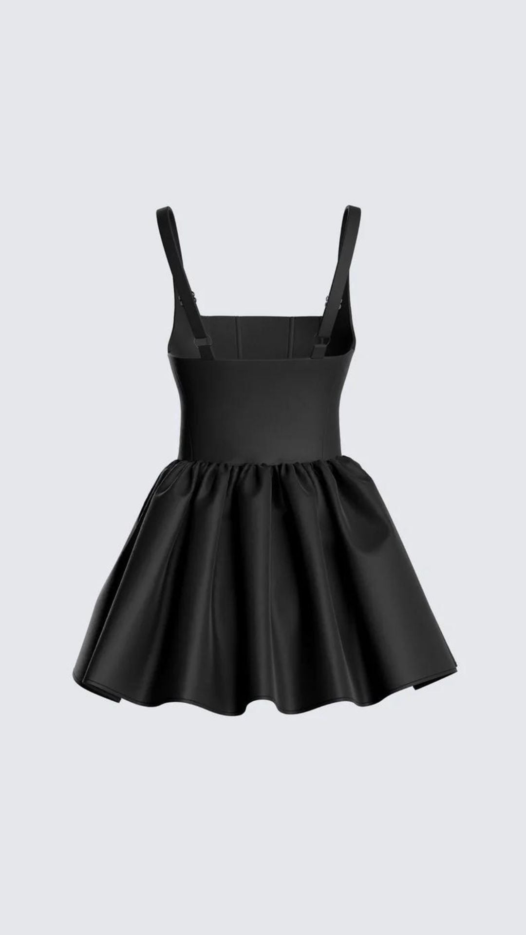 Black Mini Dress with Corset Torso and Gathered Flare Skirt – Chic and Flattering.